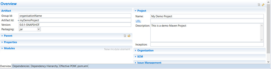 步骤6:您现在可以打开pom.xml来查看Maven设置的结构。 您将在此处看到我们在“第4步”中输入的所有信息。 您可以使用底部的标签来更改视图。 pom.xml选项卡包含用于Maven项目的pom XML代码。