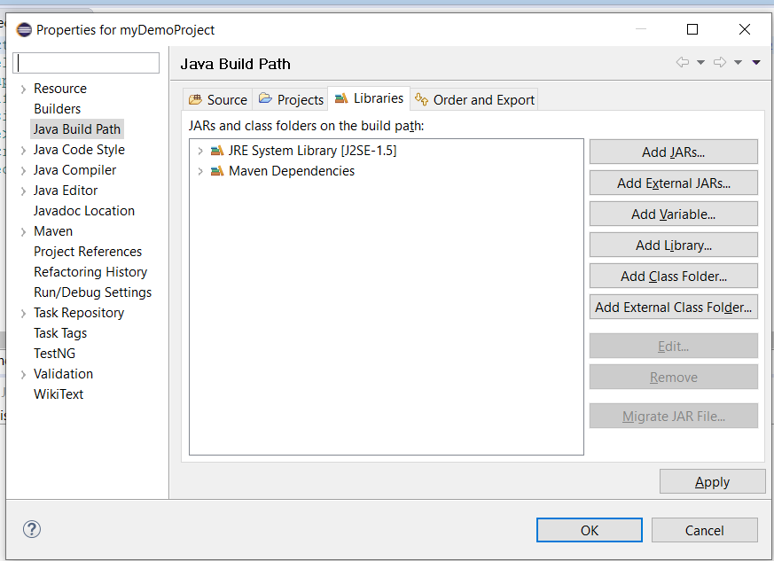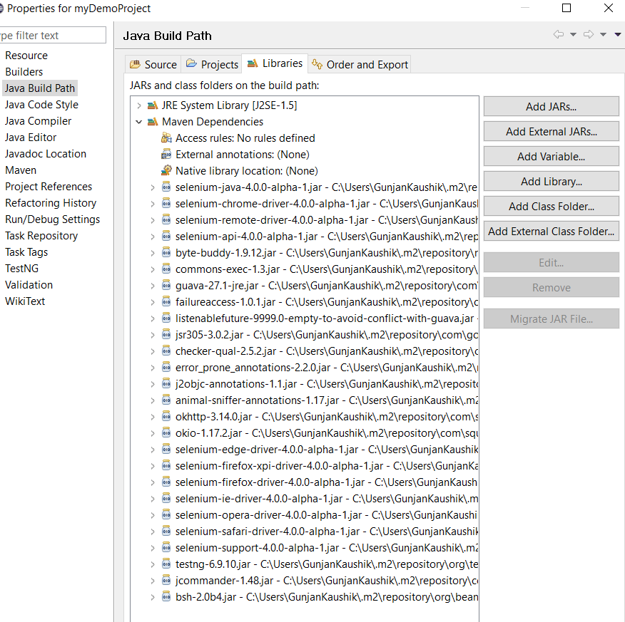 </project>如果您想验证这些Selenium Maven依赖项如何导入所需的库,则必须返回到演示项目并查看默认情况下存在哪些库。 为此,您需要右键单击您的项目名称,并为您的项目配置构建路径,然后在新打开的窗口的“库”选项卡下进行检查: