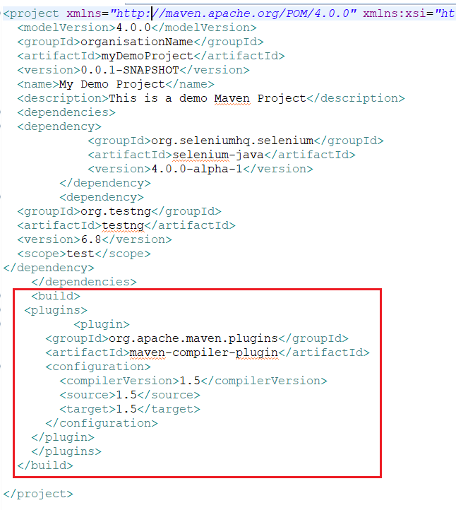 在执行第二项安装任务之前,您需要添加一个名为Maven Compiler插件的插件,否则将无法完成Selenium测试自动化构建。 该插件用于标识编译器的特定位置。 您可以在pom.xml中添加以下插件,并在执行Maven安装之前刷新项目。