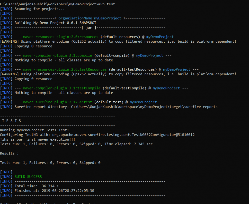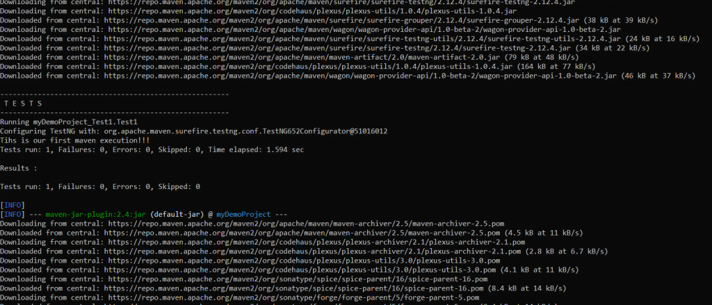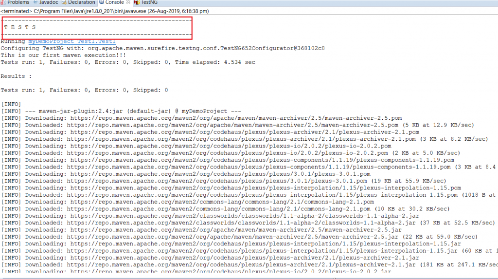 您可以看到控制台输出几乎与Eclipse执行时的输出相似。 现在让我们通过键入“ mvn test”执行Maven测试,这将导致执行该测试而无需构建jar文件。