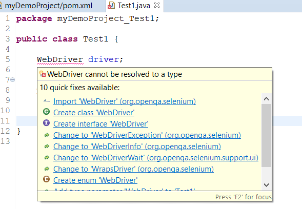 另外,您现在可以进入测试类,查看不同的选项来更正此Selenium Maven教程中引发的错误:
