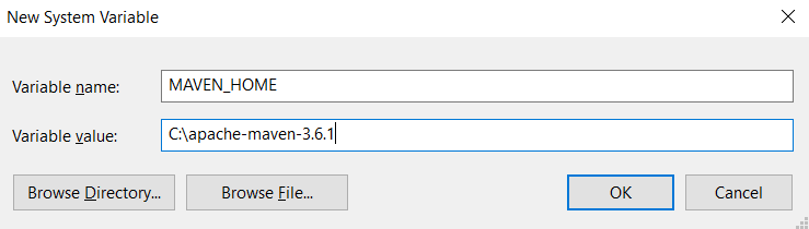 - 在“变量名”框中键入“ Maven_HOME”,在“变量值”框中键入“ C:\ apache-Maven-3.6.1”。