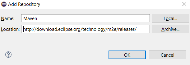 步骤3:在名称文本框中,键入“ Maven”,在位置文本框中,键入“ http://download.eclipse.org/technology/m2e/releases/”。 该URL是可以从中下载Maven的位置。