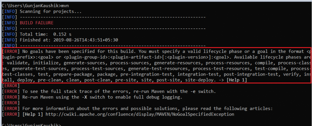 您会看到Build失败消息,显示错误,指出此Selenium Maven教程中尚未定义目标。 解析此消息时,您会看到可以为我们的Maven项目定义的不同目标。 在详细介绍Selenium项目所需的目标之前,我将快速浏览这些默认目标。