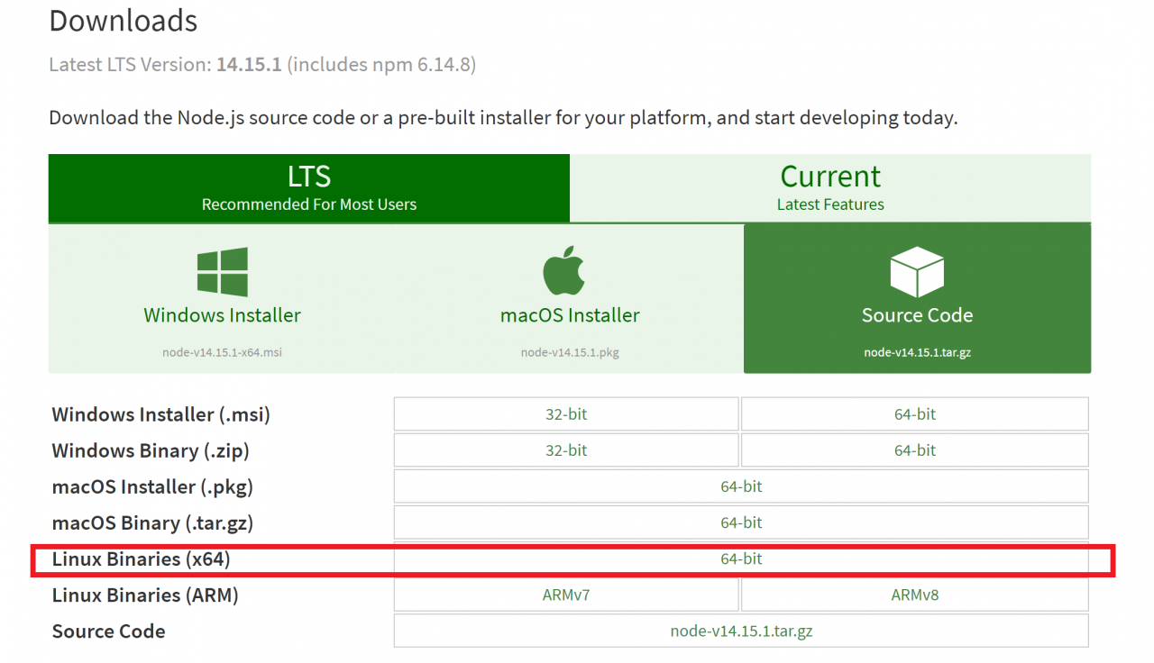 NodeJS的安装稍微有点麻烦,我们先要去到NodeJS的官网,选择下方的Linux Binaries(x64)下载。