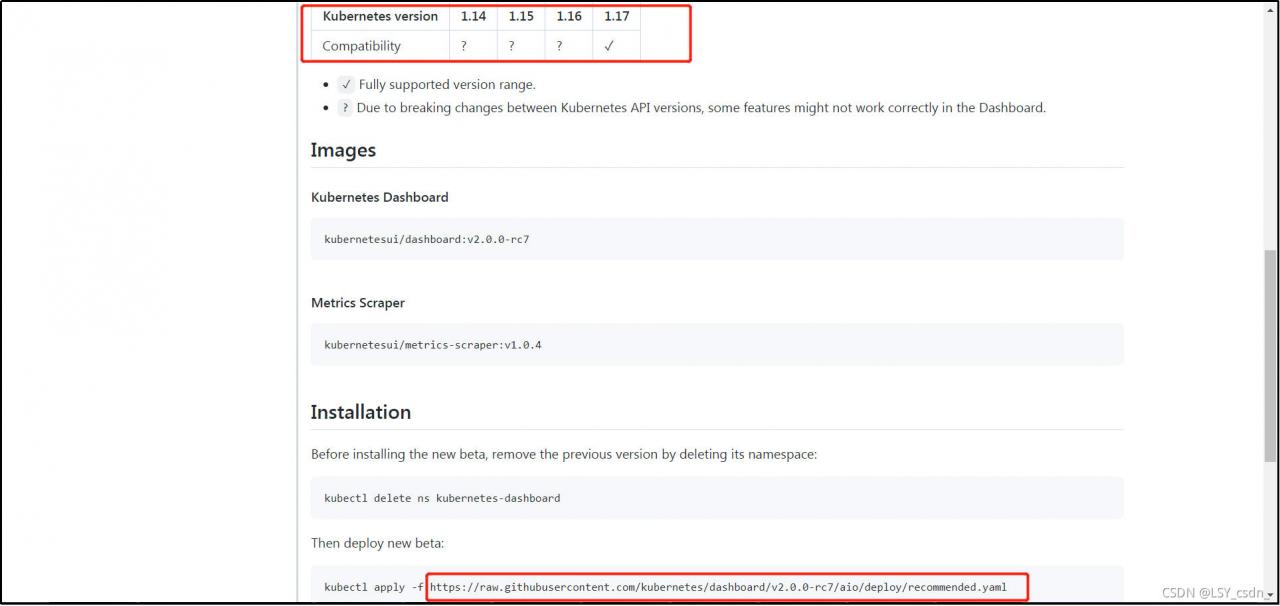 注意查看k8s兼容的dashboard版本。本次搭建的k8s版本为1.17.0,通过查看dashboard官网上不同版本的dashboard软件包能够兼容的对应k8s版本,查找到对应的dashboard版本,本次dashboard版本使用的是v2.0.0-rc7。