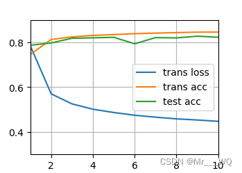 animator=Animator(xlabel='epoch',xlim=[1,num_epochs],ylim=[0.3,0.9],legend=['trans loss','trans acc','test acc'])