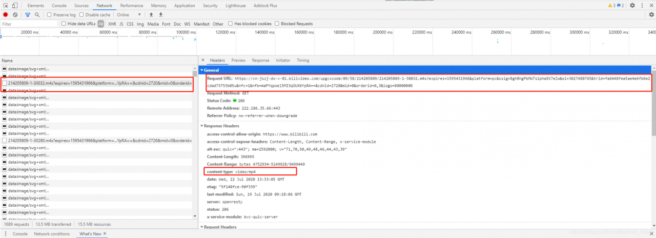 首先我们在 B 站点开一个视频(https://www.bilibili.com/video/BV1Vh411Z7j5)用 F12 分析一波,在下图中可以看到有多个 m4s 结尾的链接,并且响应的类型是 video/mp4