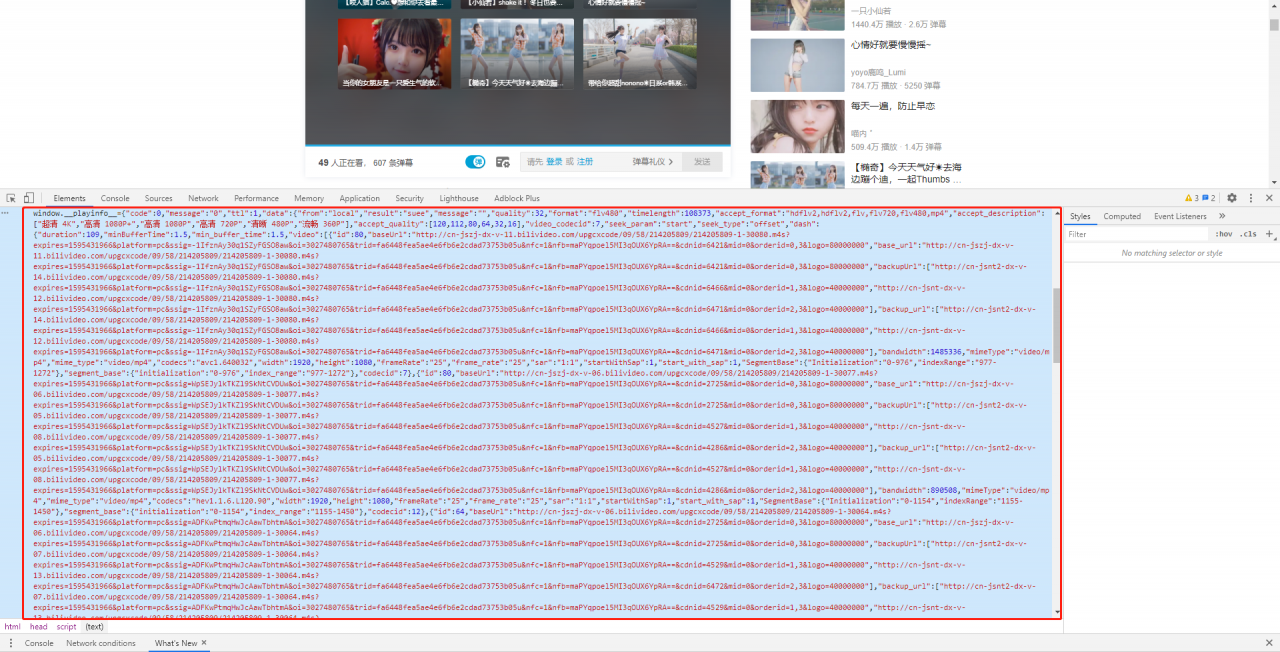 把面板打到 Elements 界面,找到一个 window.playinfo 的 javascript 变量,并且内容和上图中的 url 类似,都是 m4s 链接,目标已找到