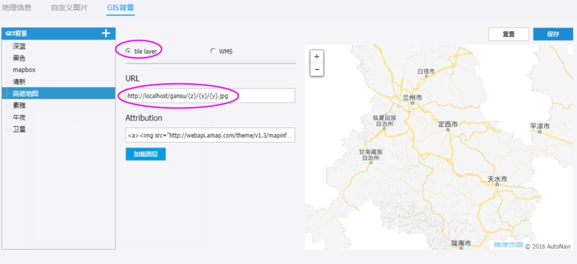 在FineReport中配置TMS服务,利用上面(图一)中生成的服务地址,在FineReport配置,选择“tile layer”或者直接选择“高德地图”将上面的地址直接拷贝到URL中,点击“保存”即可加载离线地图。