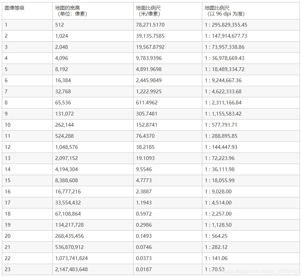 OpenLayers瓦片地图默认分辨率表(地面比例尺):