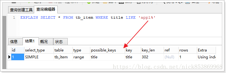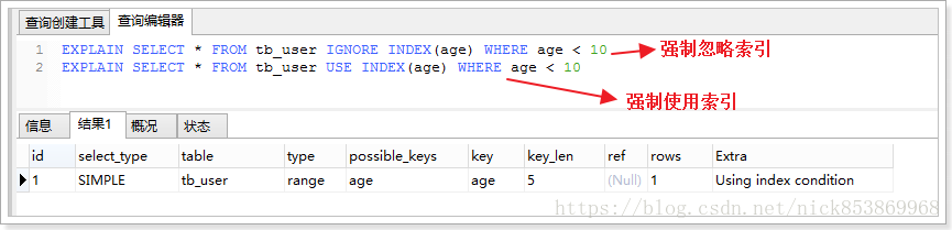 3.2.6 key:显示MySQL实际决定使用的键(索引),如果没有选择索引,键是null,可以强制使用索引或忽略索引