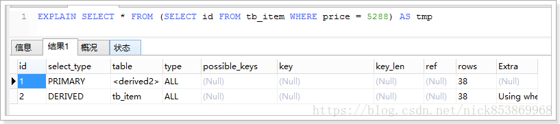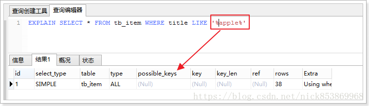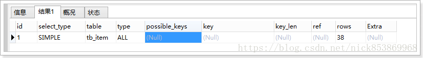 3.2.5 possible_keys:指出MySQL能使用哪个索引在该表中找到行,如果该列为null,说明没有使用索引,可以对此列创建索引来提高性能