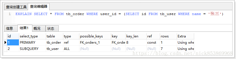 7.unique_subquery:该类型替换了下面形式的IN子查询的ref: value IN (SELECT primary_key FROM single_table WHERE some_expr)