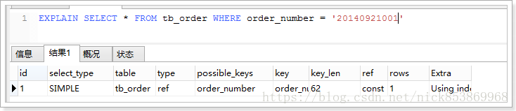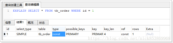 2.const:数据表最多只有一个匹配行,因为只匹配一行数据,所以很快,常用于PRIMARY或UNIQUE索引的查询,理解为const是最优化的。