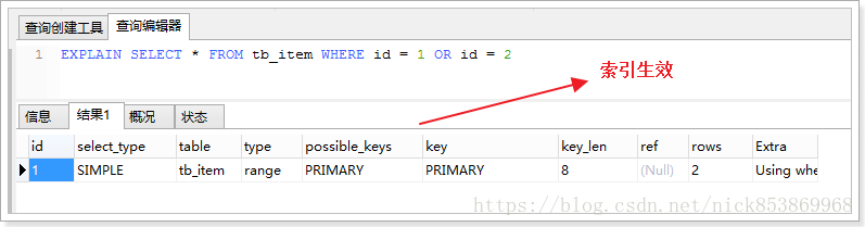 6.index_merge:该联接类型表示使用了索引合并优化方法,在这种情况下,key列包含了使用的索引的清单,key_len包含了使用的索引的最长的关键元素