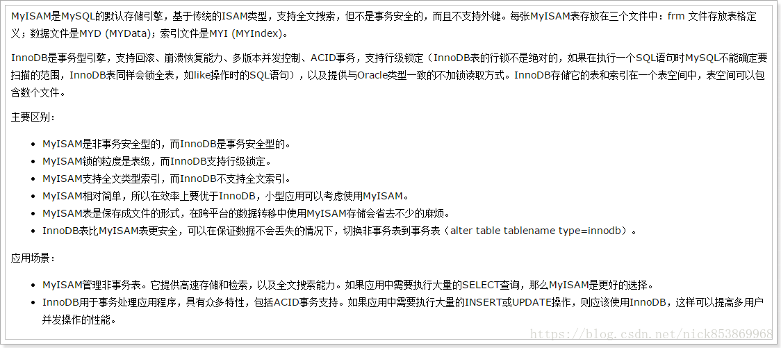 插入数据的优化,不同的存储引擎优化手段不一样,在MySQL中常用的存储引擎有MyISAM和InnoDB,两者的区别为: