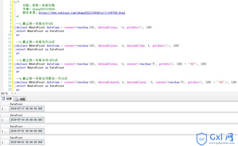 /* 功能:获取一年前日期 作者:zhang502219048 脚本来源:https://www.cnblogs.com/zhang502219048/p/11198789.html */ --1.截止到一年前当天0点 declare @datePoint datetime = convert(varchar(10), dateadd(year, -1, getdate()), 120) select @datePoint as DatePoint go --2.截止到一年前当天24点 declare @datePoint datetime = convert(varchar(10), dateadd(year, -1, dateadd(day, 1, getdate())), 120) select @datePoint as DatePoint go --3.截止到一年前当月1日0点 declare @datePoint datetime = convert(varchar(10), dateadd(year, -1, convert(varchar(7), getdate(), 120) + '-01'), 120) select @datePoint as DatePoint go --4.截止到一年前当月最后一天24点 declare @datePoint datetime = convert(varchar(10), dateadd(month, 1, dateadd(year, -1, convert(varchar(7), getdate(), 120) + '-01')), 120) select @datePoint as DatePoint go