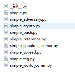 simple、simple_adversary、simple_crypto、simple_push、simple_reference、simple_speaker_listener、simple_spread、simple_tag、simple_world_comm