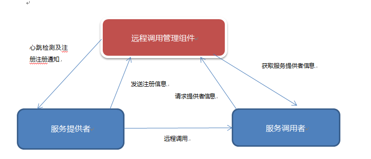 远程调用管理组件是本框架的核心,它的主要作用是接收服务端提供者的注册的通知,该通知一般是接口以及该接口的实现类还有服务器的ip地址,管理组件会将这些通知记录下来,并且根据配置对这些服务程序进行分组和标记,注册好的信息管理组件会将这些信息推送到服务调用者。远程调用管理组件还包含心跳机制,这个心跳机制是针对服务提供者,通过心跳机制检测服务提供者的健康状况,管理组件不会检测服务调用者的健康状态,因为这个没必要,因为本框架的使用还是调用者直接去请求提供者,逻辑上是没必要关心调用者的状态,这和bs架构里浏览器一样,我们不会去关心浏览器用户是不是存在。服务提供者、服务调用者和远程调用管理组件的关系如下图所示: