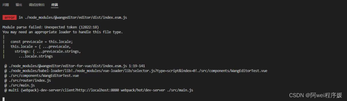 import { Editor, Toolbar } from '@wangeditor/editor-for-vue'就出现了报错,把这句引入注释掉,报错信息就会消失, 报错信息如下: