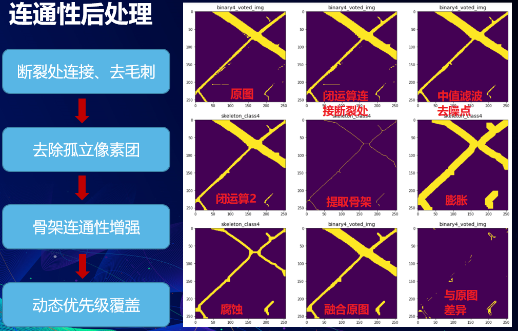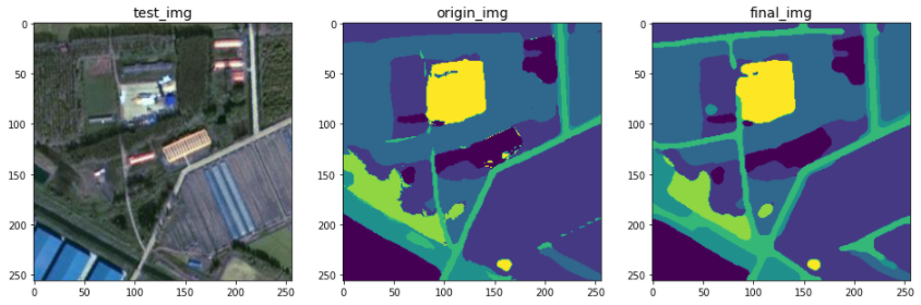 最后,我们使用形态学处理,进一步提高了连通性。首先,我们用闭运算连接断裂处,再用中值滤波去除毛刺;其次,用面积和长度筛选阈值孤立像素团,并用左边像素类别进行替换去除;然后,我们设计了骨架连通性增强方案,提取出某类的骨架,并适当地膨胀腐蚀,保证连通的同时不会过度超出原始预测区域;最后,我们设计了一个动态优先级算法,动态地进行不同类别的覆盖(主要考虑水体与道路类覆盖优先级)。