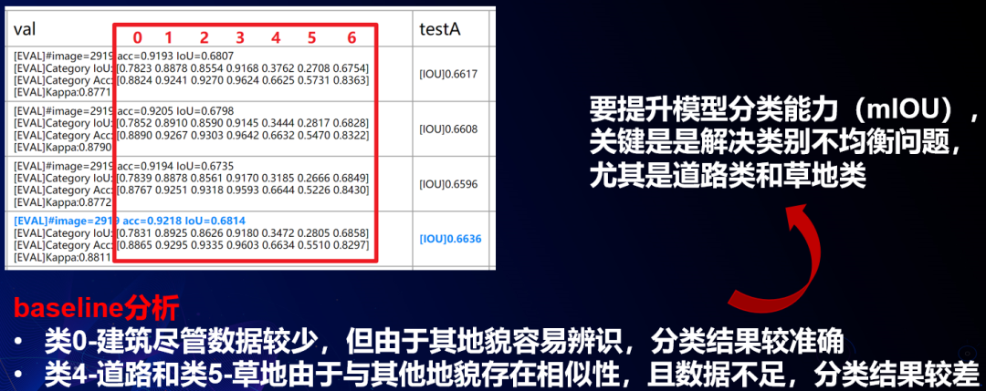 分析飞桨官方提供的baseline,我们可以发现,尽管建筑类数据较少,但由于其地貌容易辨识,分类结果还是比较准确的;而道路和草地类,则因为与其他类存在相似性,且训练数据不足,因此结果较差。所以,提升模型分类能力(mIOU)的关键是解决类别不均衡问题,尤其是道路类和草地类。