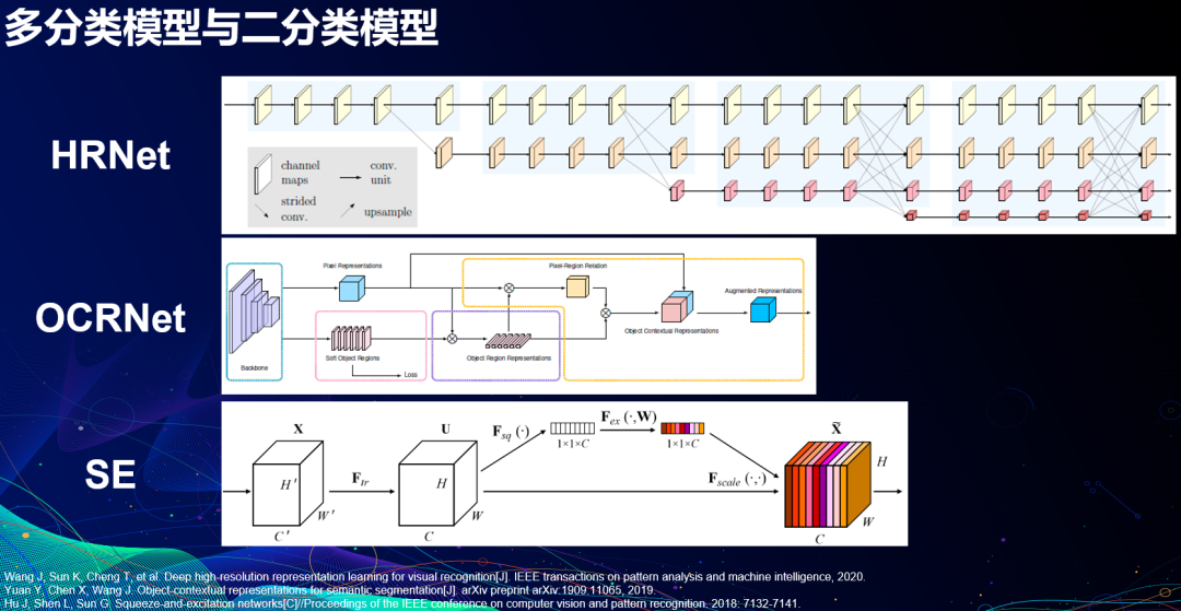 有了这些数据,我们训练了一系列以HRNet和OCRNet为骨干网络的模型。在训练过程中,我们也探索了SE、CBAM、scSE等注意力机制模块(Attention Module),最后采用了提升效果最多的SE模块。由于比赛经验生疏,我们当时错误地训练了部分大模型,然而融合后提升微薄。事实上,模型差异越大,后续融合结果一般更好。实际环境下,若考虑计算开销,也许训练U-Net等诸多小模型融合,效果更好,速度更快。