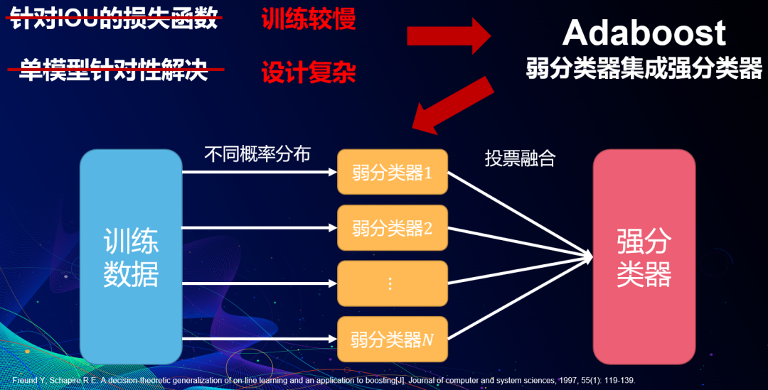 要解决这些问题,直接的方式是使用针对IOU设计的损失函数进行re-weighting(如Lovasz-Softmax loss、Focal loss等),但训练较慢,结果收敛不稳定。其次,我们可以针对特殊类设计模块,但结构复杂且周期长。最终,我们借鉴了Adaboost的思想,用不同概率分布的训练数据训练一系列弱分类器,并通过投票融合得到强分类器。需要注意的是,此处数据并不是每轮增加错误样本权重,弱分类器的“弱”也是指特殊类别上弱,融合权重根据准确率与连通性需求人为规定。