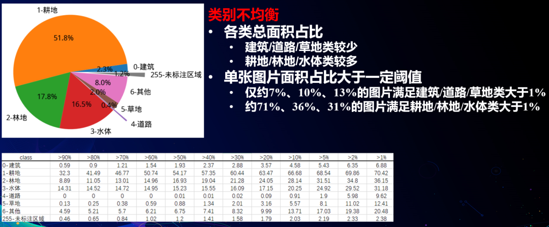 统计数据集中的各类面积占比如图3饼状图所示,从中,我们可以发现数据集中存在类别不均衡现象,建筑、道路和草地类占比较少,而其他类占比较多。当我们完成进一步的统计工作,可以得知只有分别约7%、10%、13%的图片分别满足建筑、道路、草地面积占比大于1%。数据存在极度类别不均衡现象,常规的方法并不适于训练。