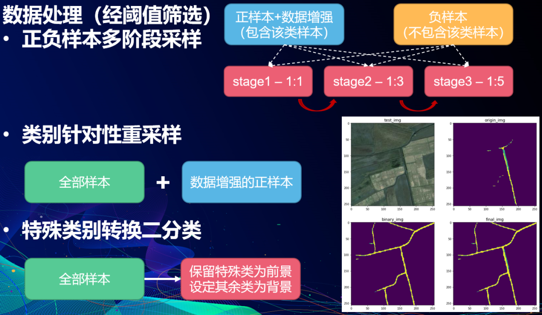 (1)划分道路类和草地类正负样本(负样本指不包含该类的样本),多阶段逐步增加负样本比例,可以借鉴Bengio的课程学习(Curriculum Learning)思想,由简单到复杂训练,结果更好收敛;