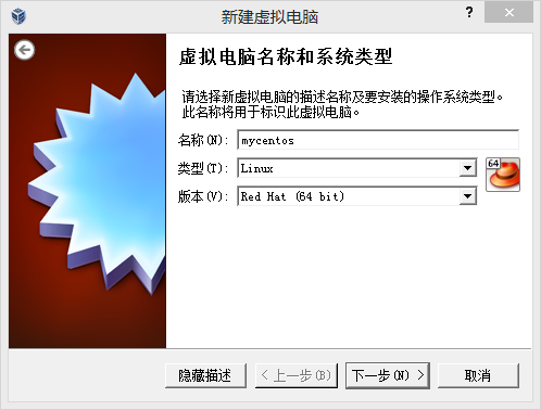 2.命名虚拟机名称,选择类型及版本(centos和redhat是一模一样的,可选32位和64位,本机现在选择了64位,可后来发现不能安装,无奈重新配置了32位,--!悲剧!),下一步