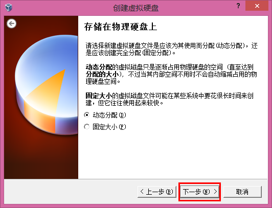 6.如果硬盘空间足够,动态分配即可,下一步