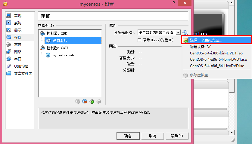 8.(这里可以在各个标签页进行配置修改比如在常规进行32和64位进行转换,--!)选择存储,配置镜像