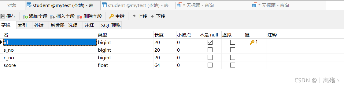 INSERT INTO `mytest`.`student`(`id`, `s_no`, `c_no`, `score`) VALUES (1, 1025, 9000, 98);