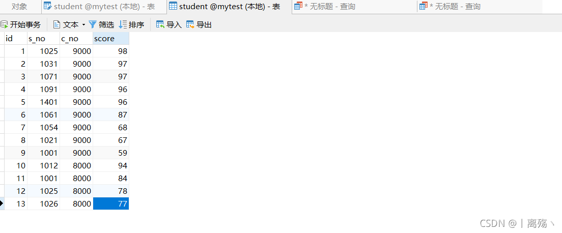 INSERT INTO `mytest`.`student`(`id`, `s_no`, `c_no`, `score`) VALUES (13, 1026, 8000, 77);