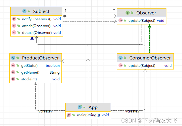 }Observer:一个接口,成为观察者,观察者模式中属于多方。它一般需要实现以下功能