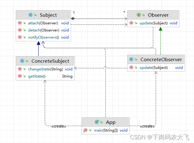 ConcreteSubject:具体的目标实现对象,里面会维护目标状态,当状态改变时,通知所有观察者。