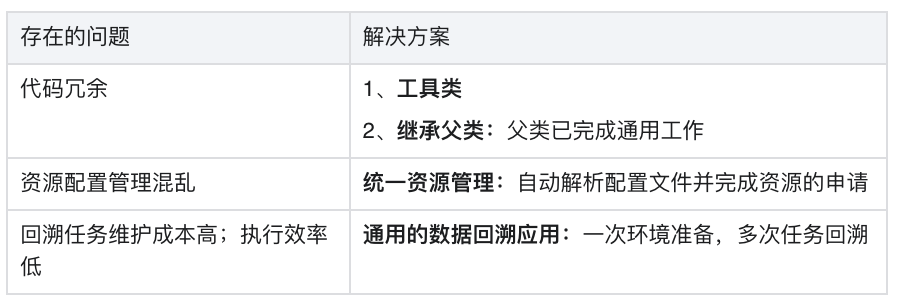 针对目前现状,我们开发了一套 Spark 离线开发框架,如下表所示,我们例举了目前存在的问题及解决方案。框架的实现不仅让开发变得简单高效,而且对于数据的回溯工作在不需要任何开发的情况下,快速高效地完成大量的回溯工作。