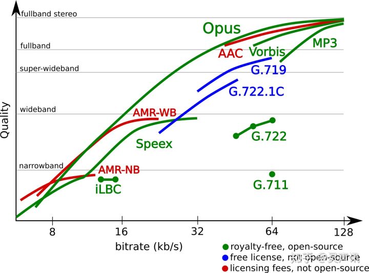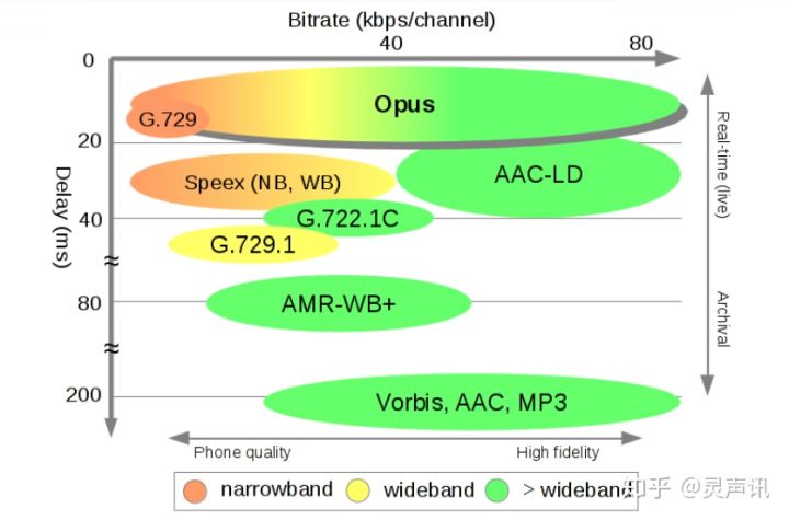 延迟:Opus具有非常低的算法延迟(默认为22.5 ms),非常适合用于低延迟语音通话的编码,像是网上上的即时声音流、即时同步声音旁白等等,此外Opus也可以透过降低编码码率,达成更低的算法延迟,最低可以到5 ms。在多个听觉盲测中,Opus都比MP3、AAC、HE-AAC等常见格式,有更低的延迟和更好的声音压缩率。