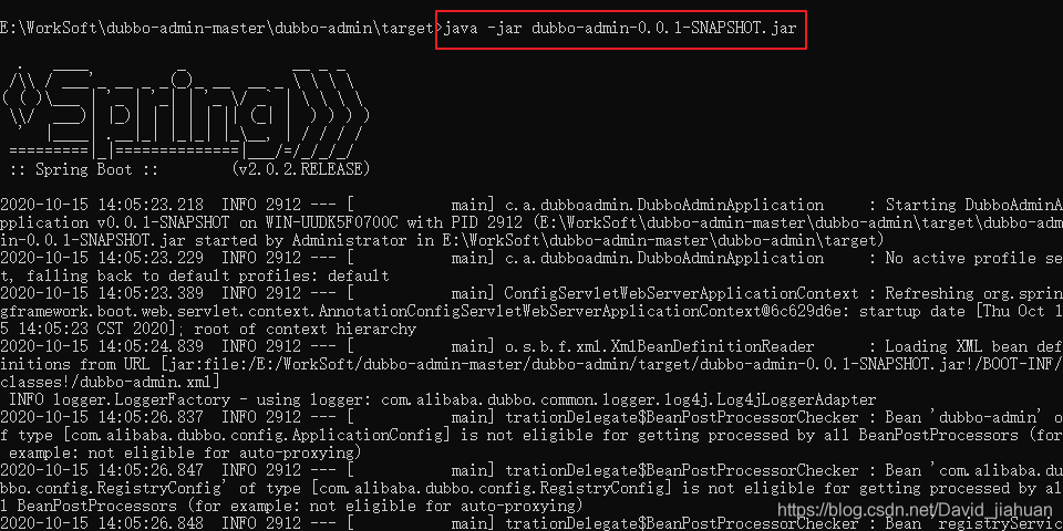 4、最后我们通过命令行窗口执行下面的命令,运行dubbo-admin-0.0.1-SNAPSHOT.jar包: