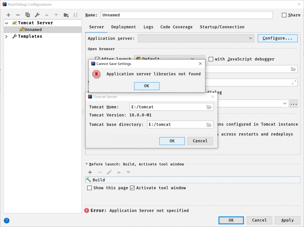 【Tomcat】Application server libraries not found错误信息:Application server libraries not found1. 这是因为笔者用的Tomcat 10,版本过高,换成Tomcat 9就解决问题了2.将Tomcat版本换成9后 版权声明:本文为giftedpanda原创文章,遵循CC 4.0 BY-SA版权协议,转载请附上原文出处链接和本声明。原文链接:https://blog.csdn.net/giftedpanda/article/details/106015717