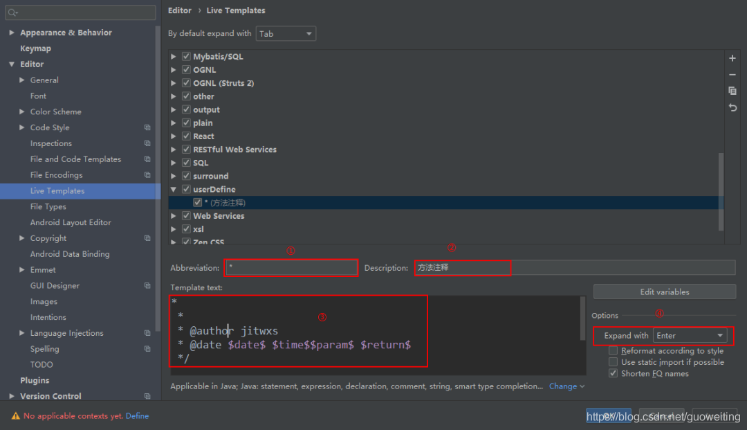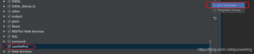 然后选中刚刚创建的模板分组 userDefine,然后点击 +,选择 1. Live Template: