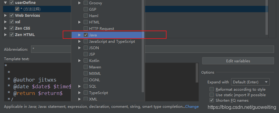 点击 Define,在弹框中勾选Java,表示将该模板应用于所有的 Java 类型文件