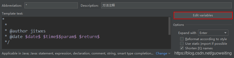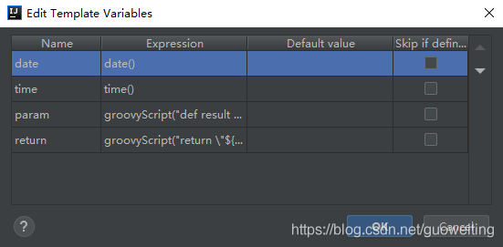 还记得我们配置 Template text 时里面包含了类似于 $date$ 这样的参数,此时 IDEA 还不认识这些参数是啥玩意,下面我们对这些参数进行方法映射,让 IDEA 能够明白这些参数的含义。点击 Edit variables 按钮: