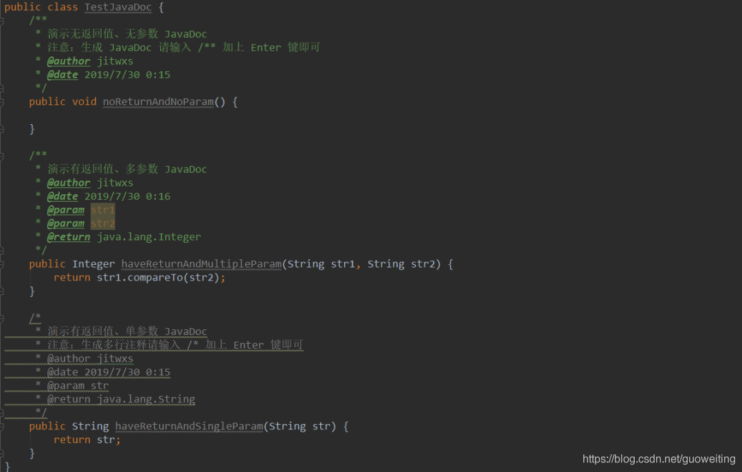 这也同时说明了为什么注释模板首行是一个 * 了,因为当我们先输入 /*,然后输入 * + Enter,触发模板,首行正好拼成了 /**,符合 Javadoc 的规范。