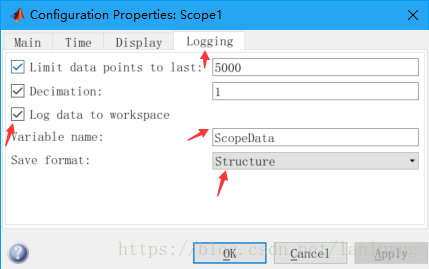 4. 点击logging,勾选log data to workspace;variable name自己命名(这里的命名是ScopeData),save format可选择Structure