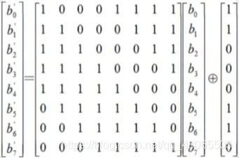 直接查表可以得出,同样也可以通过计算的方法,原理:先计算输入字节的乘法逆元,将乘法逆元乘以如下矩阵再与01100011做异或运算,如:输入数据95,其乘法逆元为8a,二进制表示为10001010,进行计算后得出结果00101010,16进制表示为2a。
