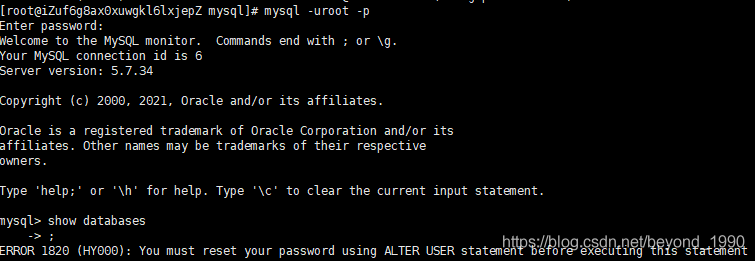 3.此时,登录上MySQL,但无法做其他操作,必须先修改初始密码,并刷新: