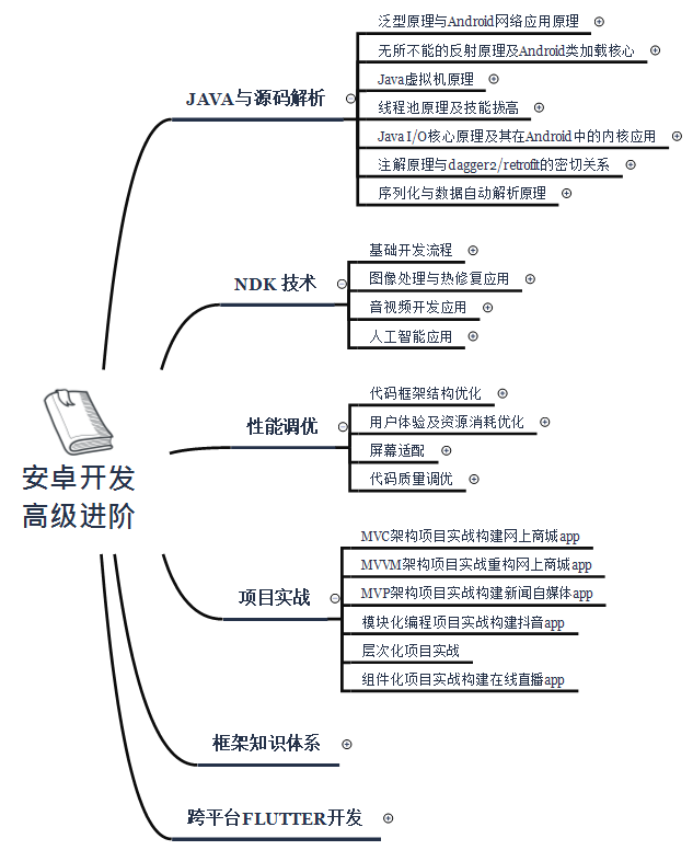 除了基础扎实的java知识,数据结构算法,设计模式还要求会底层源码,NDK技术,性能调优,还有会些小程序和跨平台,比如说flutter,以思维脑图的方式展示在下图;